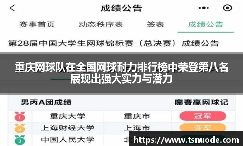 重庆网球队在全国网球耐力排行榜中荣登第八名,充分展现了这支队伍的强大实力与潜力。这一成绩不仅是对球队长期努力训练的认可,更是对未来发展的良好预示。本文将从四个方面进行详细阐述:首先,分析重庆网球队的训练体系及其优势;其次,探讨队员们的个人素质与竞技能力;接着,介绍重庆市对于网球运动的重视及支持;最后...